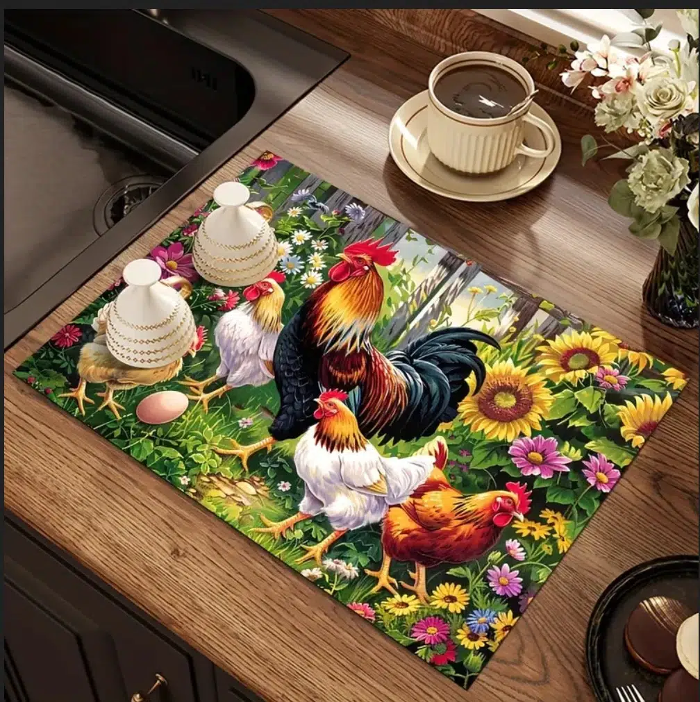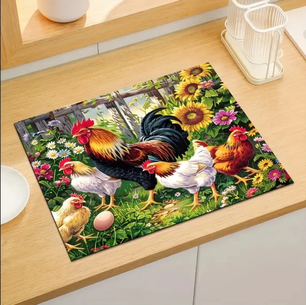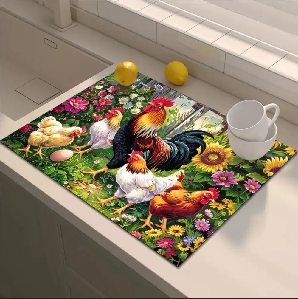 55cm x 45cm HOROZ VE TAVUK TASARIMI TEZGAH ÜSTÜ BULAŞIK KURUTMA MATI BULAŞIKLIK KURUTMA ÖRTÜSÜ