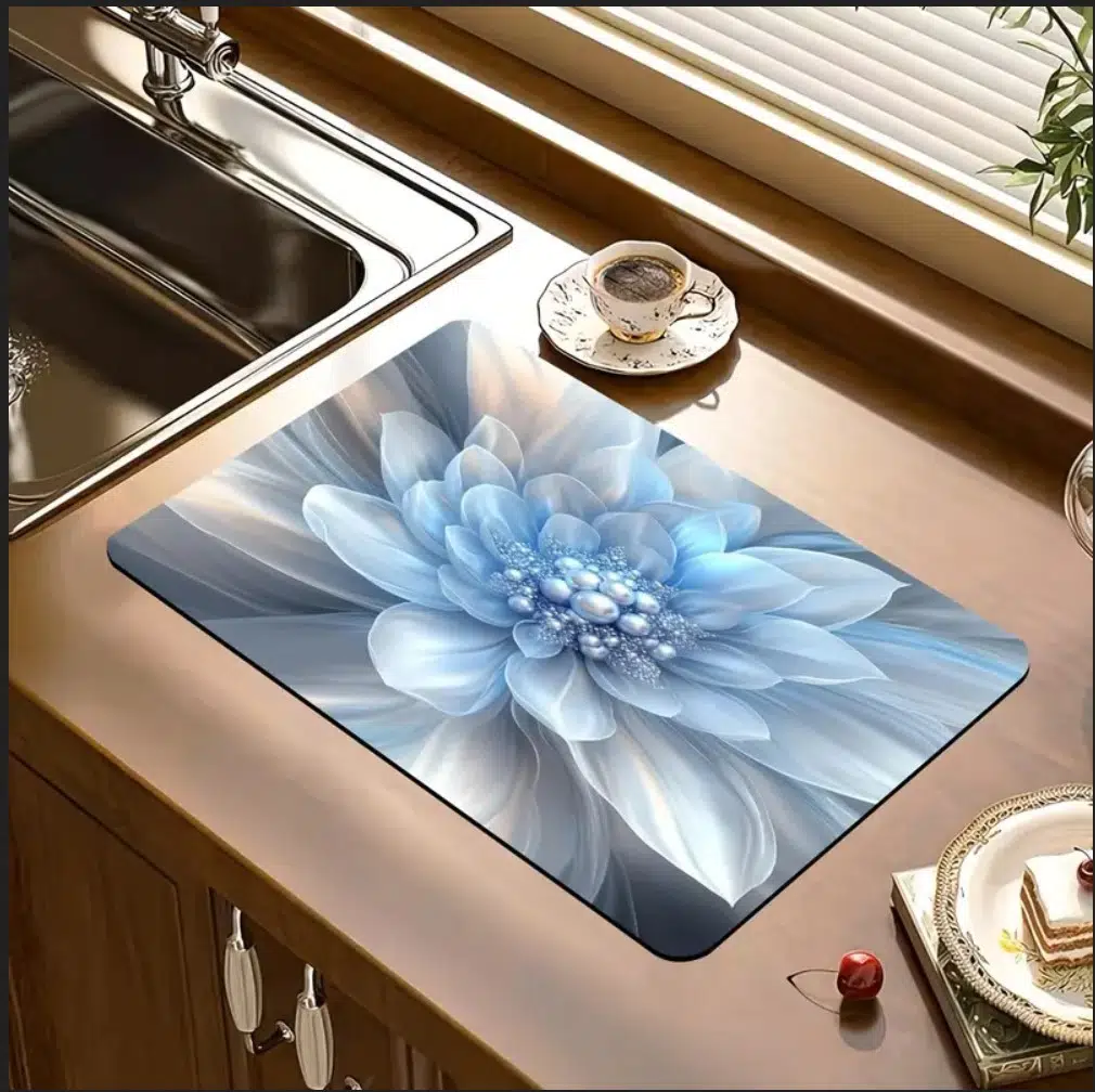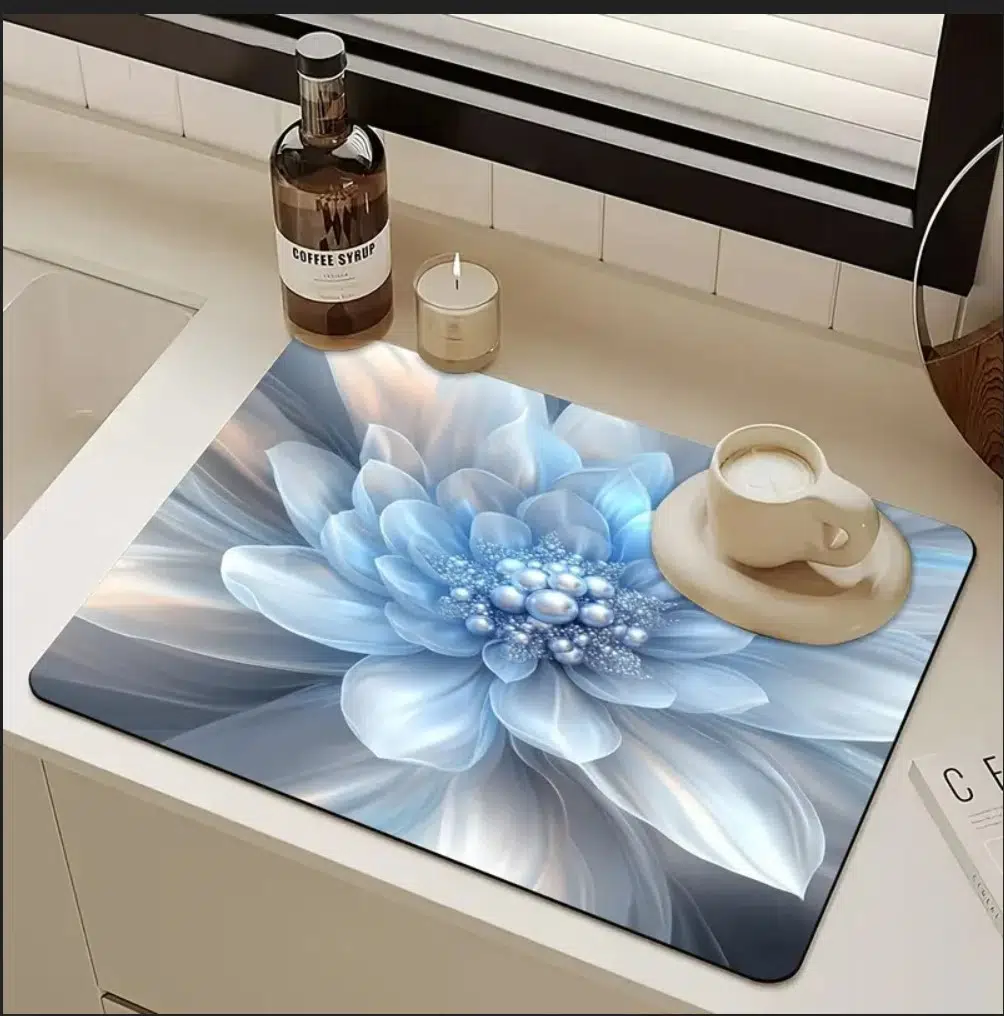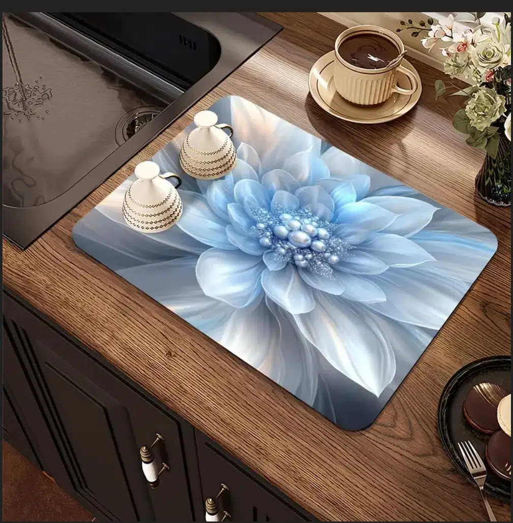 55cm x 45cm MAVİ İNCİ ÇİÇEK DESENLİ TEZGAH ÜSTÜ BULAŞIK KURUTMA MATI BULAŞIKLIK KURUTMA ÖRTÜSÜ