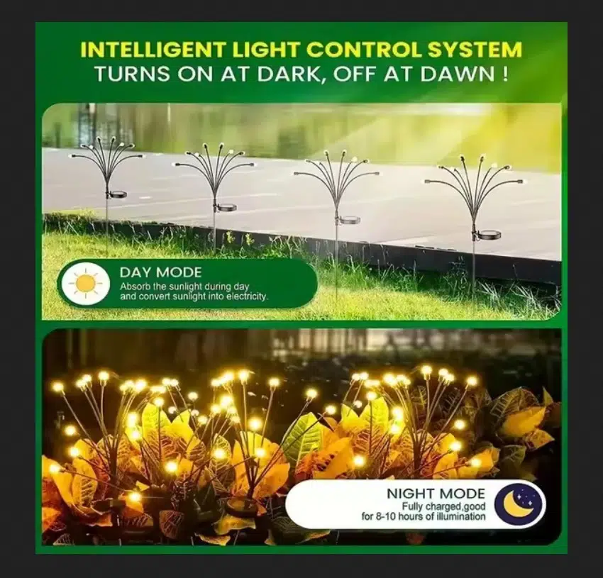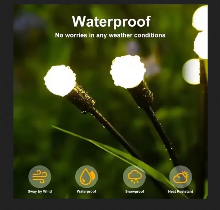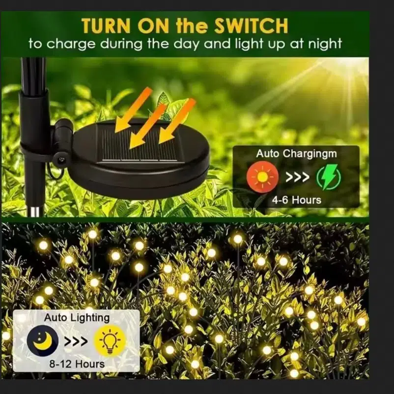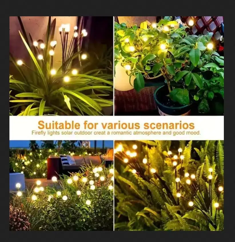 Rüzgar estiğinde sallanma: Güneş enerjili dekoratif ışıklar çok yumuşak ve esnek tel ile desteklenir.yani rüzgar estiğinde güneş enerjisiyle sallanan ışık rüzgarla birlikte sallanır.Dans edici güzelliği romantik bir atmosfer yaratır ve geceleri bahçeye sıcaklık katar, açık havada bahçe dekorasyonları hediye etmek için uygundur!