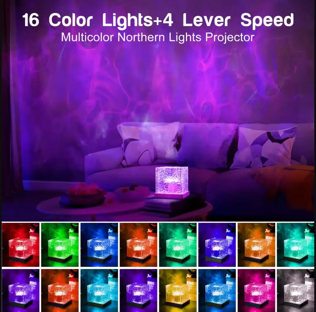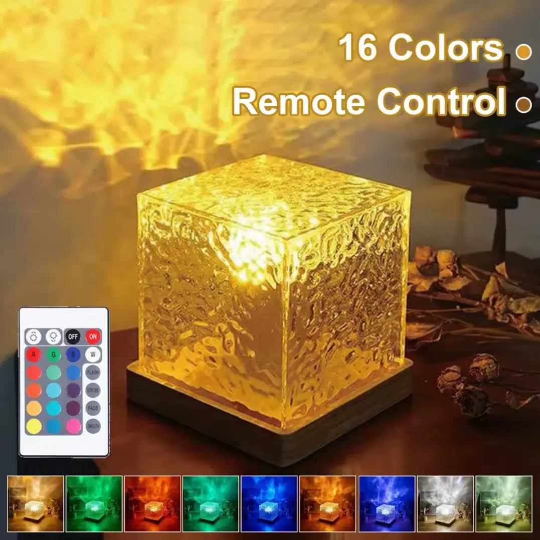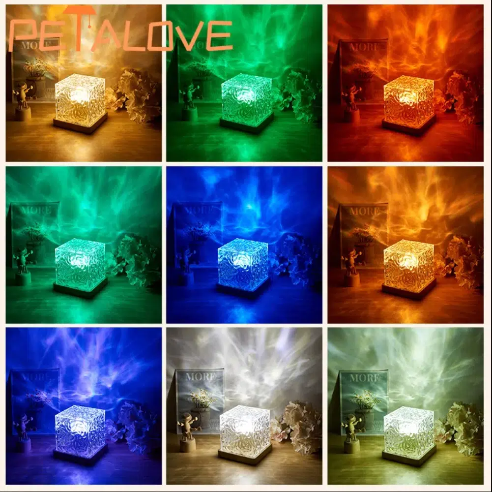 3. 16 renkli kristal lamba:Dönen su dalgalanma küçük gece lambası renkli aydınlatma etkisi altında duvarlarda 3D görsel alev/dinamik desenler atmaktadır. Parıltılı ışıkla birleştirilen zarif görünümü, eşsiz bir çağrışım ve sanatsal bir mizacı ifade ederek, ışık ve gölgenin muhteşem bir görsel şölenini yaratır.