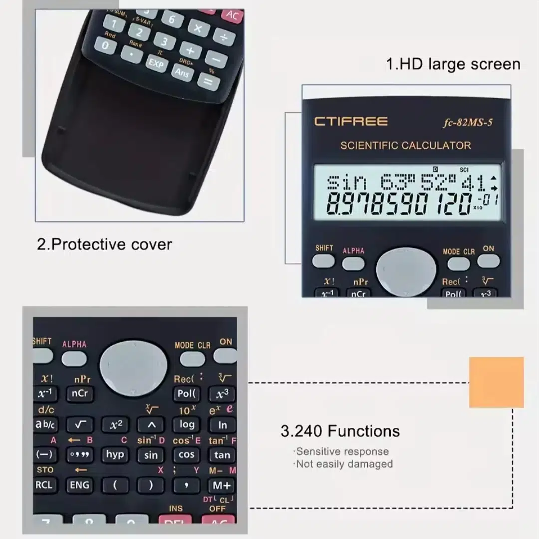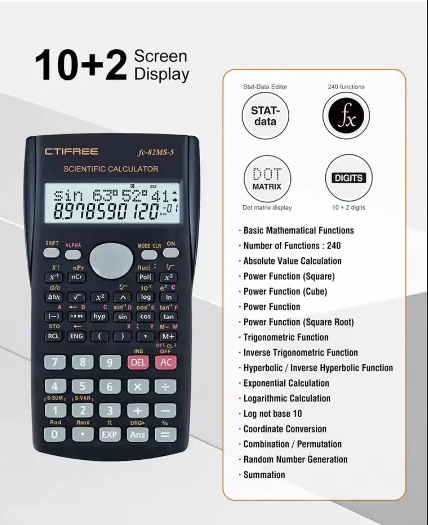 -FC-82MS, gelişmiş matematik ve bilim dersleri için mükemmel olan 240 fonksiyonlu yüksek performanslı bir bilimsel hesap makinesidir. Cebir, cebir I, cebir II, geometri, trigonometri, matematik, AP matematik, AP istatistikleri, biyoloji, kimya, fizik, finans ve iş eğitimi alan öğrenciler için önemli bir araçtır.